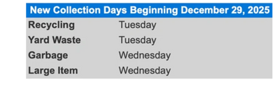 Starting 12/29/2025 collection of trash will occur on Tuesdays for recycling and yard waste. Garbage and large item pickups will be on Wednesdays.